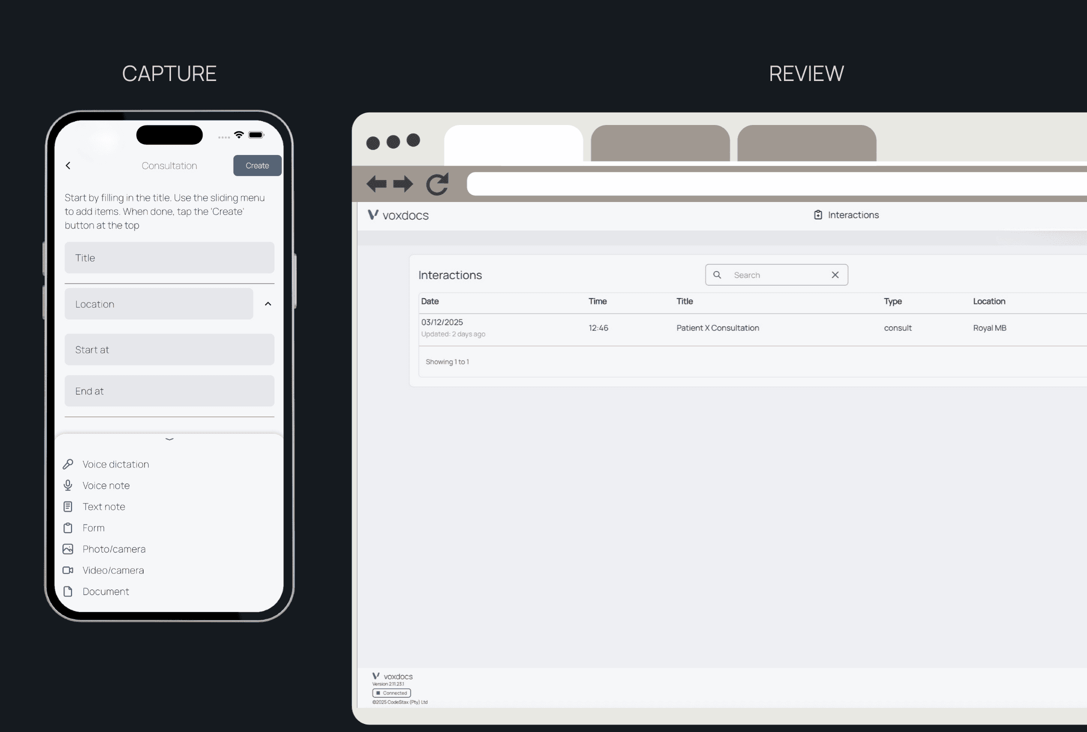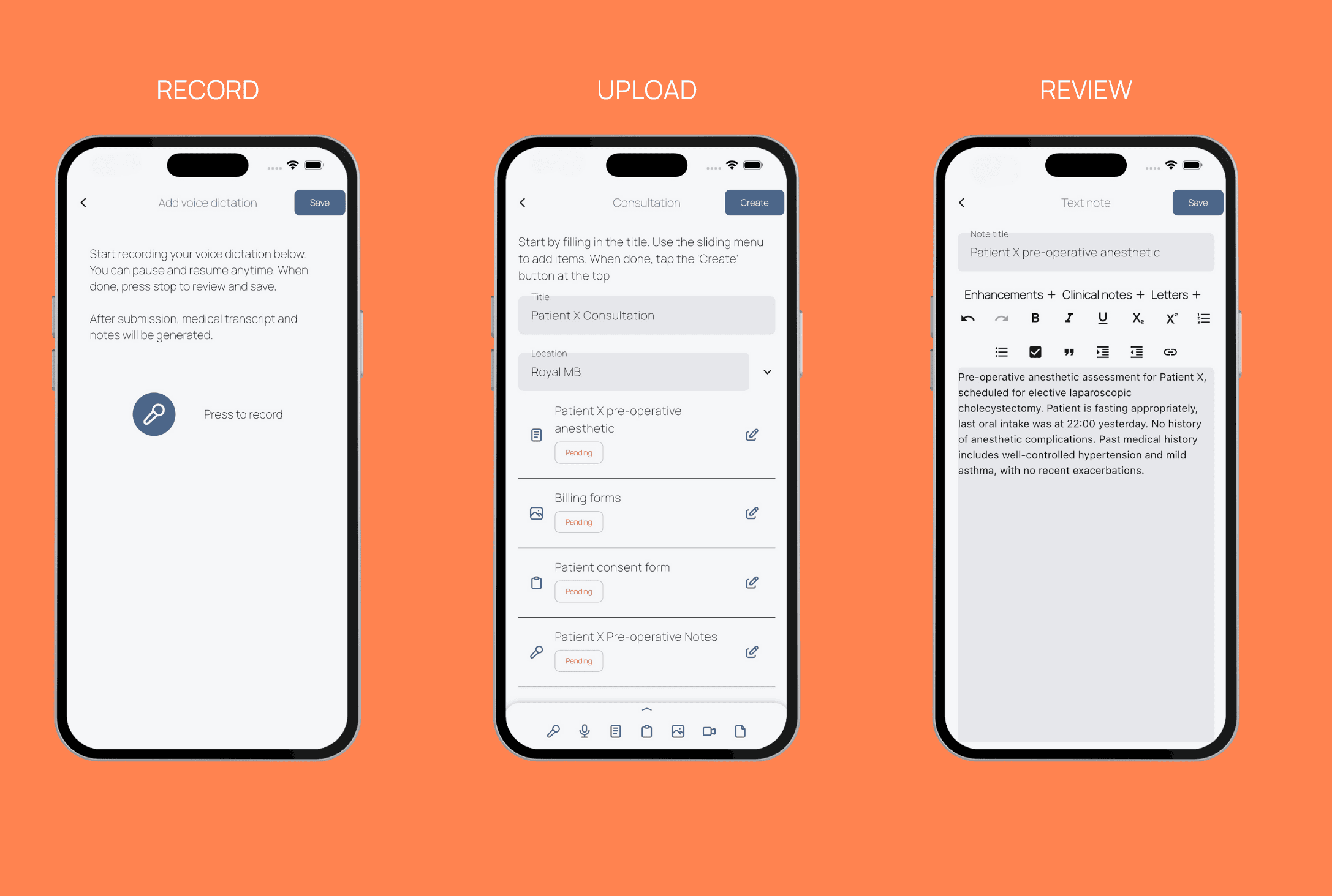 Our VoxDocs app available on iOS and Android, enables clinicians to capture clinical documentation and automate workflows from bedside consultation to final completion.